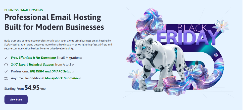 ScalaHosting offers web-based email hosting as part of its cloud and VPS plans. It helps businesses get fast email performance without relying on big tech companies. The service gives you full control over your inboxes and keeps everything secure on private servers. With ScalaHosting, Emails load fast because it uses high-performance servers with strong uptime.